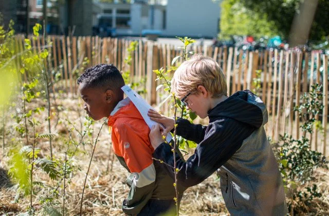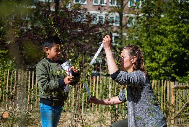 Bart Jalving en Louwra Postma van IVN lopen rond om de kinderen te helpen en vertellen ondertussen meer over hun werk. “Er zijn kinderen die echt nooit buiten de stad of zelfs de wijk komen. Die groeien op tussen baksteen en beton en hebben geen idee hoe leuk het is om in de natuur te zijn.” zegt Bart. Louwra vult aan “Een deel van ons werk is dan ook om uit te leggen waarom de natuur zo belangrijk is en hoe fijn het is om natuur om je heen te hebben. Met een tiny forest brengen we die natuur dichtbij en laten we hen dat plezier ook ervaren. Om te zien hoe uit een klein takje in een paar jaar een jonge sterke boom groeit is fantastisch. Zeker als het ‘jouw boom’ is.”