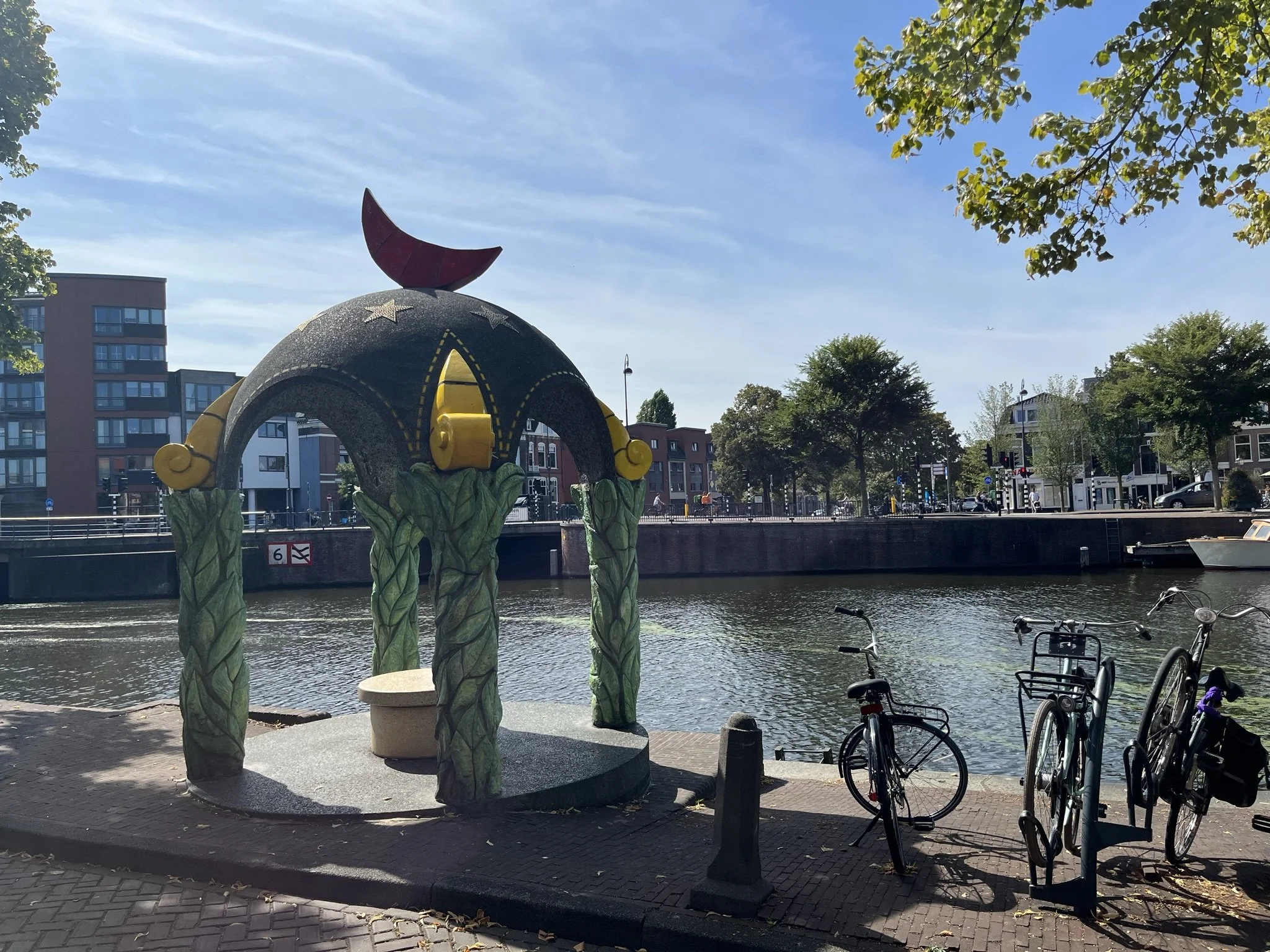 Aan het Spaarne in de schaduw van de Verfroller staat sinds 1995 een prieel, een koepeltje met pilaren van groene bladeren. Het heeft gele krullen, een hemelgewelfje vol sterren en een meloenschijf als halve maan. Erin staat een rond bankje. Het is een wat vreemd ogend ding aan onze waterkant dat tegelijkertijd wat idyllisch, exotisch en romantisch aandoet en het heeft wat weg van het werk van architect Antoni Gaudi. Een stichting die meerdere kunstbankjes wilde plaatsen langs het Spaarne gaf Dora Dolz de opdracht dit prieeltje te vervaardigen. En dus ging zij met dezelfde kinderlijke vrolijkheid aan de slag als een paar jaar eerder met haar Fata Morgana-fruitmanden. Ze wilde licht, lucht en kleur aanbrengen op een plek waar bak- en straatstenen overheersten. Vandaar de groene pilaren. Ze wilde ons een sterrenhemel geven, opdat wij Haarlemmers eens omhoog kijken en ons verwonderen. En, ze wilde haar Spaanse hart laten spreken en ons meegeven dat jong en oud een passievolle, romantische plek als een decor van een mini-opera kan ervaren aan het kabbelende Spaarne (een van de weinige plekken aan de oostkant van het Spaarne waar je in de zomer het langst van de ondergaande zon kunt genieten).