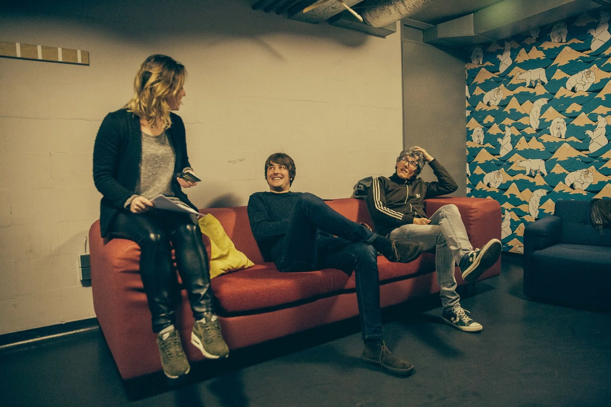 Anne: “Het eerste wat mij te binnen schiet bij Dave (zanger, gitarist) is dat hij volgens mij een gewone gitaar op z’n kop houdt en met de snaren dus ook omgekeerd, speelt. Dat is echt bizar. Hij is links, maar hij heeft een rechtshandige gitaar gepakt en gewoon omgedraaid, dus zijn hoge E zit volgens mij boven en zijn lage E zit onder. Misschien kunnen jullie hem vragen of dat klopt? En waarom hij dat op deze manier doet?”